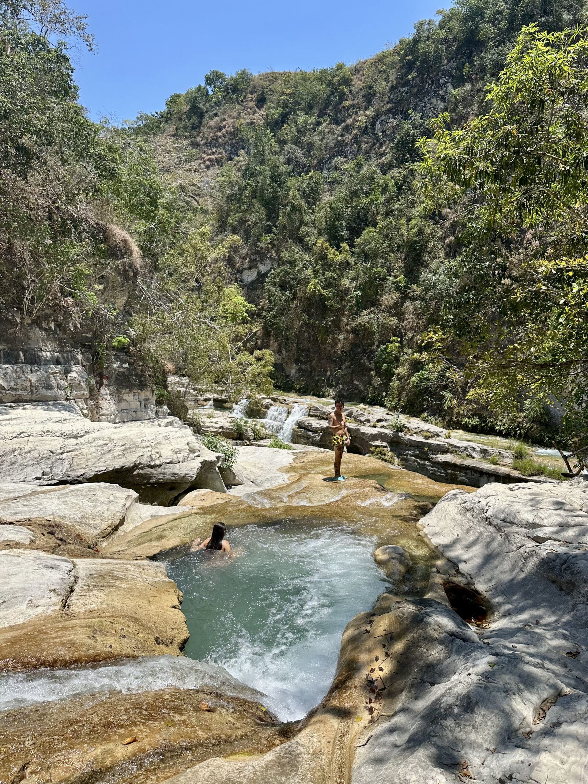Au fond de la gorge, l’eau circule entre les roches, formant des piscines naturelles aux teintes claires.