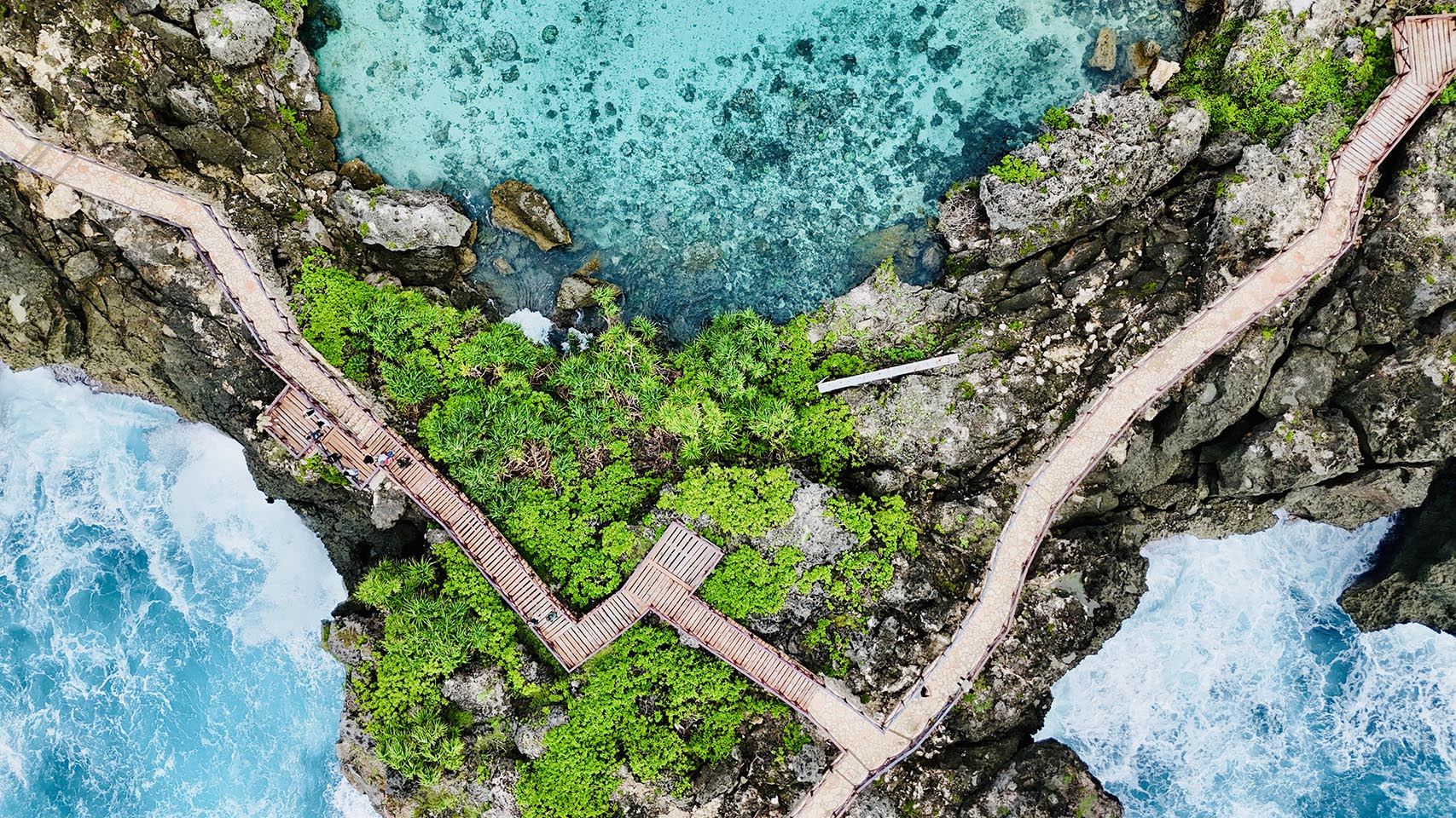 The ocean filters through the rock, nourishing a saltwater lagoon that reflects the light like a living mirror.